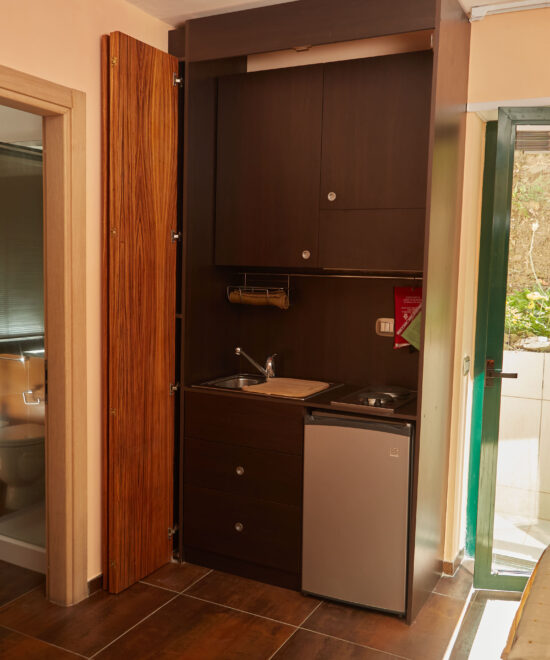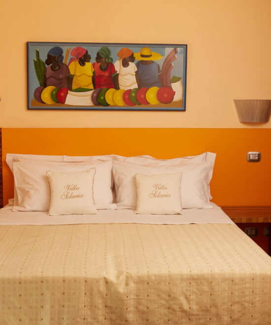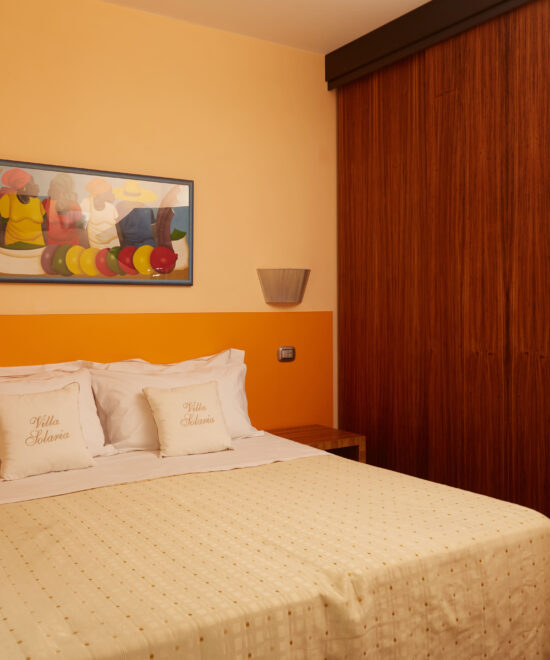 E’ una comoda matrimoniale con letti separabili, dotata di bagno interno e porta-finestra apribile con area cortilizia esterna privato sul retro della villa, lato monte.
