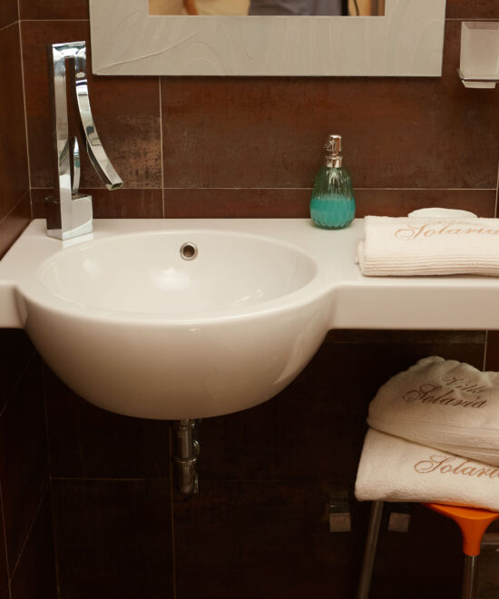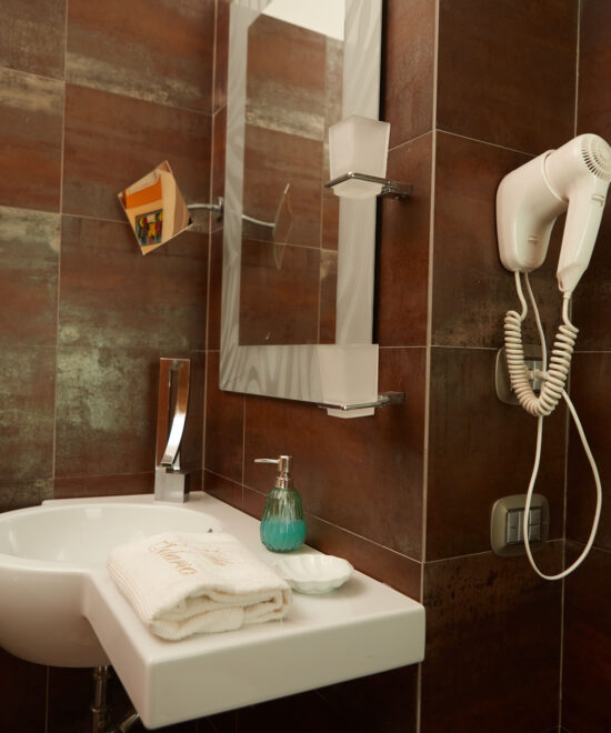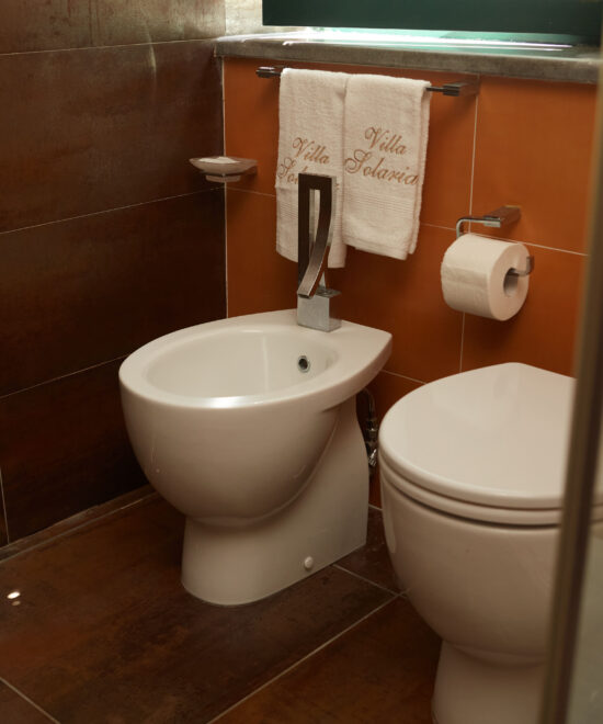 • set bagno per ciascun ospite (asciugamano corpo, asciugamano bidet, accappatoio, telo piscina), kit doccia, n°1 rotolo di carta igienica
