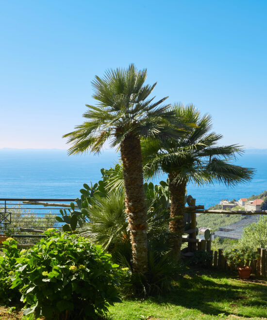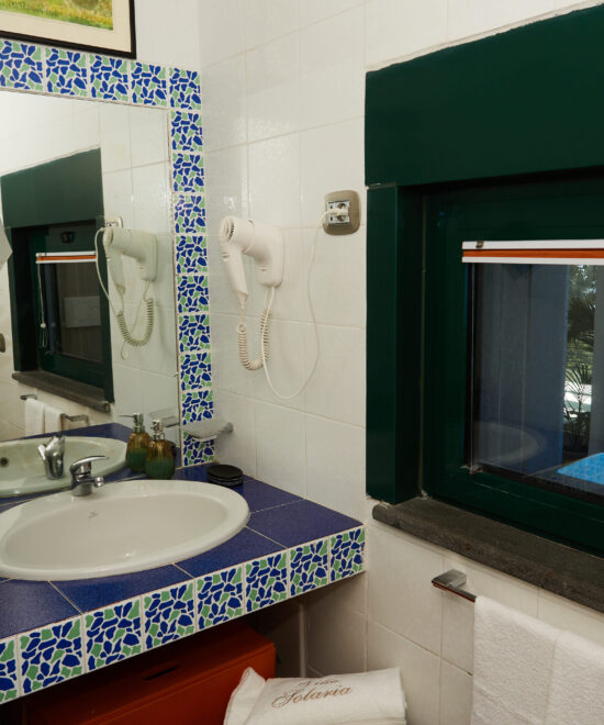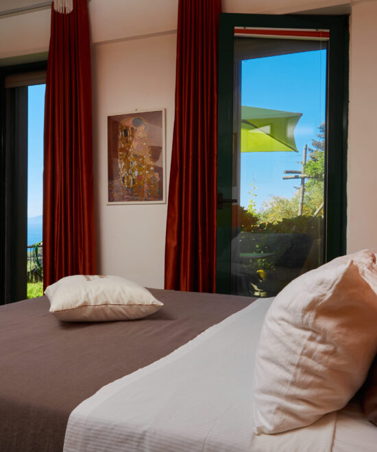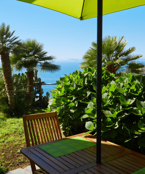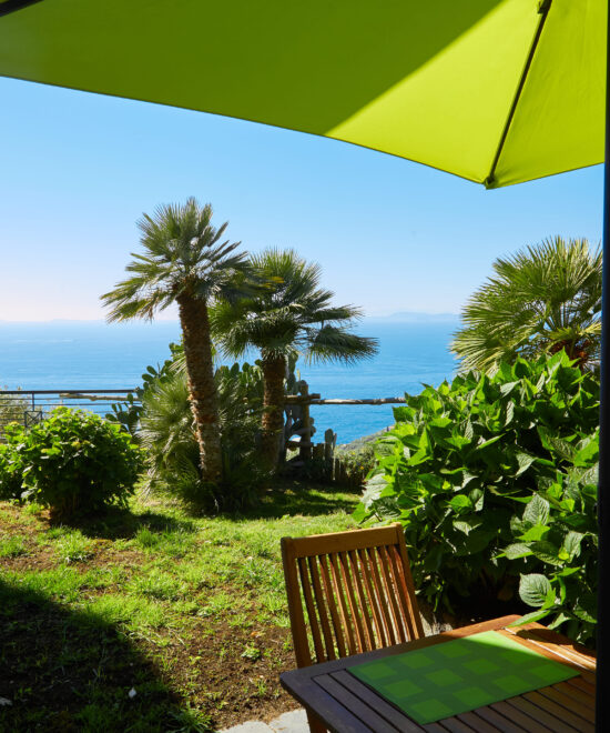 E’ una comoda matrimoniale con letti separabili, dotata di bagno interno e due porte-finestreapribili con area cortilizia esterna privata attrezzata, con vista mare e giardino.