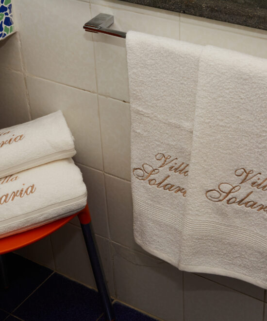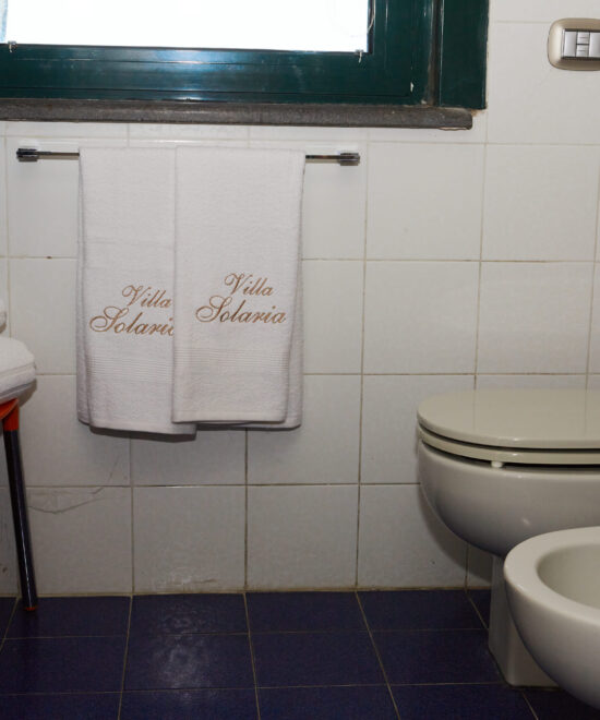 • set bagno per ciascun ospite (asciugamano corpo, asciugamano bidet, accappatoio, telo piscina), kit doccia, n°1 rotolo di carta igienica